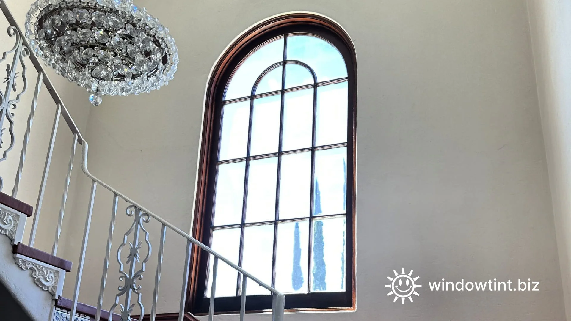 Arched staircase window treated with clear window film in Redlands, CA to help control heat and sunlight without altering the architectural appearance of the glass.